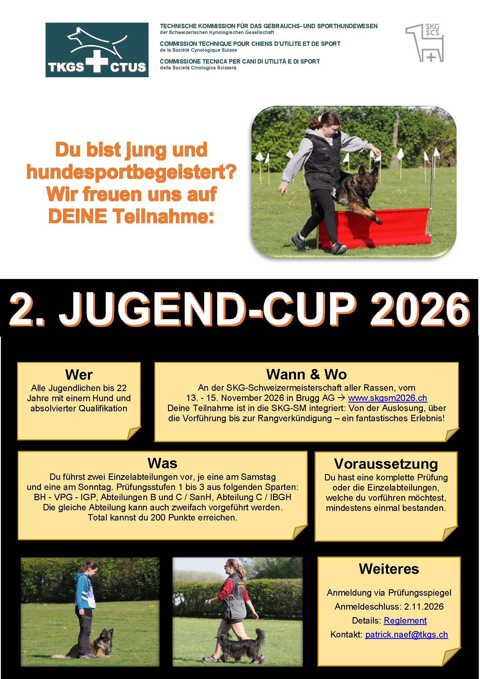 Der Jugend-Cup wird auch in diesem Jahr durchgeführt. Im Rahmen der SKG-SM aller Rassen können die jugendlichen StarterInnen während zwei Einzelarbeiten wieder ihre Vierbeiner präsentieren: